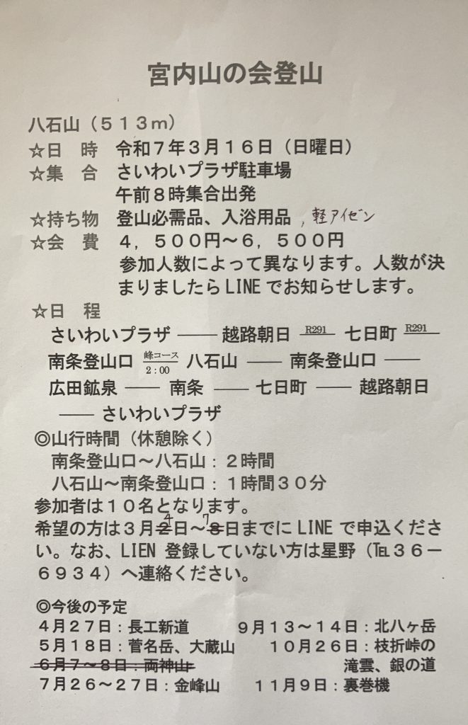 募集 八石山 南条登山口 峰コース 天候不良のため中止